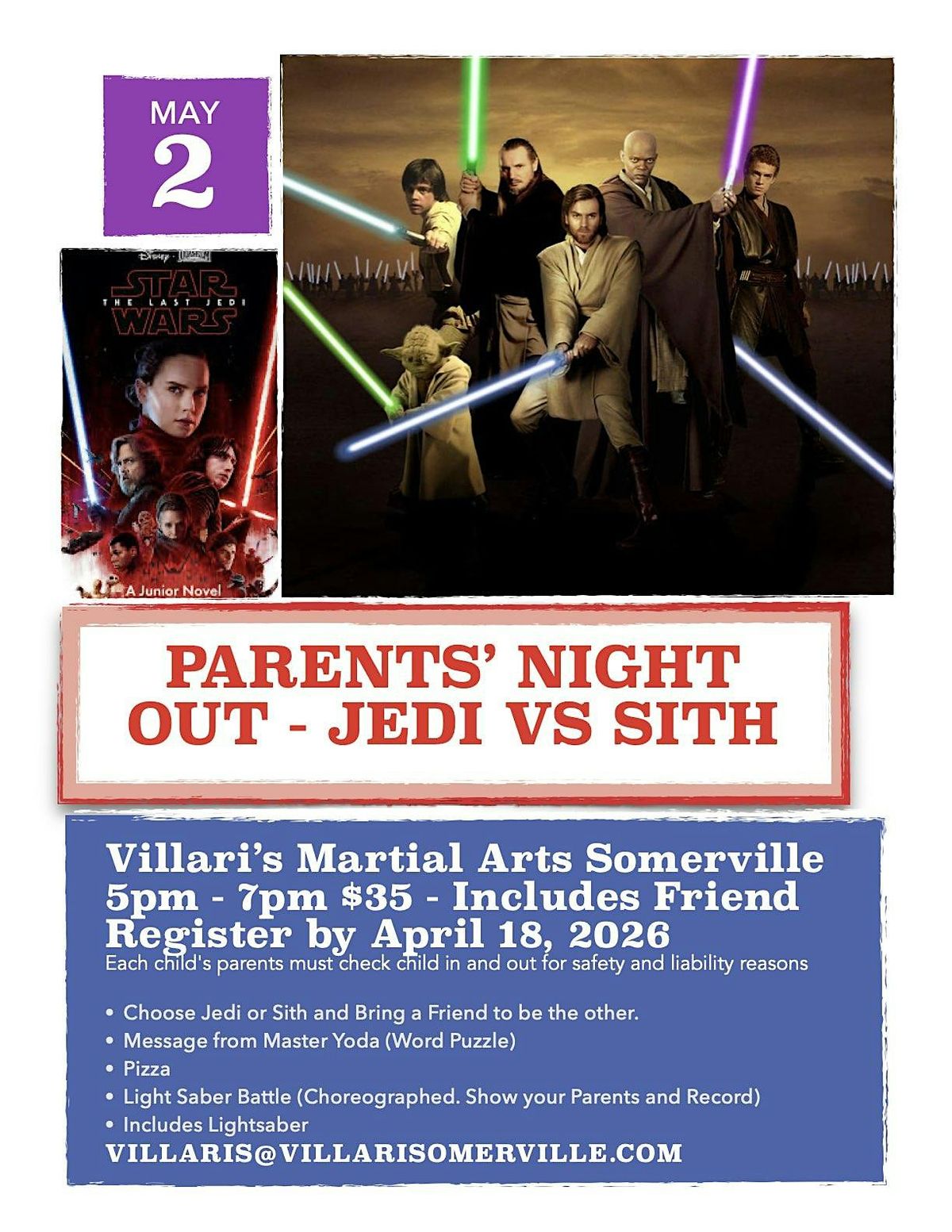 Ready for a fun night where the Force will be strong? Join us in person for Parents' Night Out and pick your side: Jedi or Sith! Enjoy an evening full of galactic adventures, epic battles, and plenty of laughs. It's the perfect chance for parents to unwind while kids dive into a galaxy far, far away. Don’t miss out on the ultimate showdown!