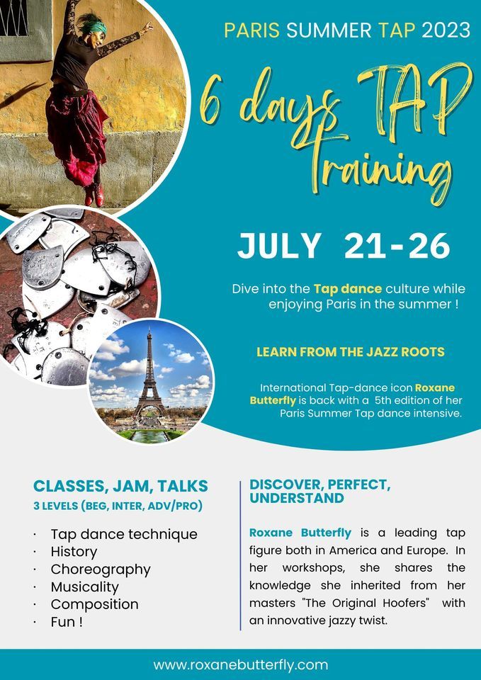 Roxane Butterfly's annual Paris Summer Tap well sought after rendez-vous, is back for a 5th edition on JULY 21st-26th 2023. Enjoy 6 days of tap dance training in Paris with an international tap dance master! A unique journey into the tap dance culture with one of the few heirs of the legendaries Original Hoofers.