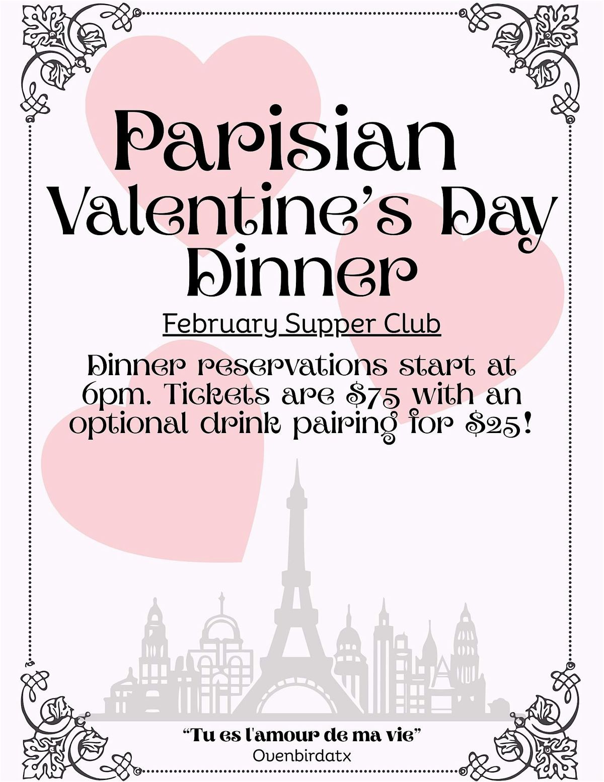 Welcome to the Parisian Valentines Day Dinner! Join us on Saturday, February 14th for a romantic evening with a delicious four- course French inspired meal. Indulge in a culinary experience that will transport you to the streets of Paris right here at Ovenbird. Don't miss this opportunity to show your special someone how much you care in a truly enchanting setting. Grab your tickets now and make this Valentine's Day one to remember!