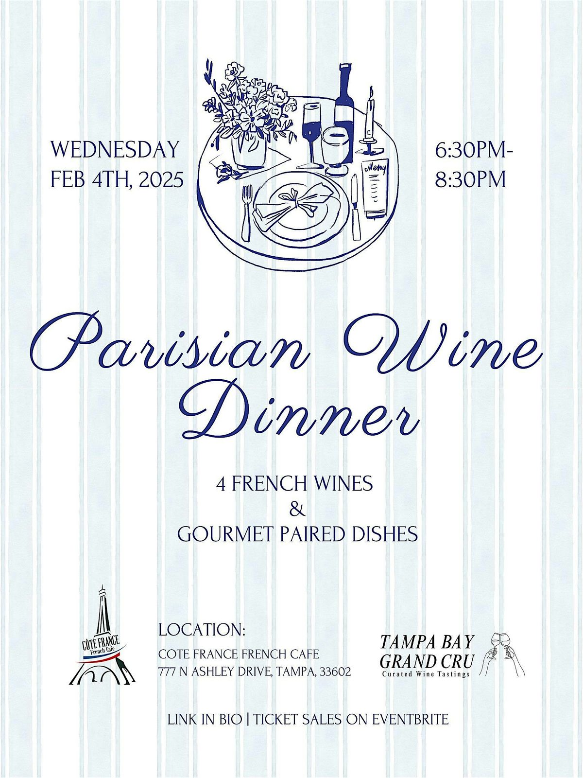 Join us for an intimate Parisian Wine Dinner featuring a curated selection of French wines paired with delicious French dishes, inspired by the flavors and charm of Paris. Enjoy an elegant evening of fine wine, food, and conviviality in the heart of downtown Tampa.