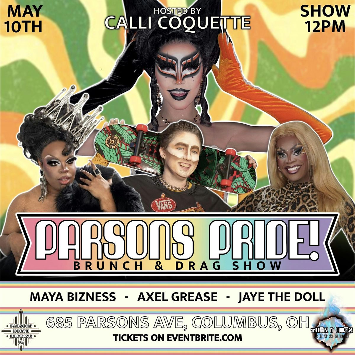 Welcome to PARSONS PRIDE! Brunch and Drag Show at Parsons North Brewing Company! Get ready for a fabulous afternoon of delicious brunch, drinks, and jaw-dropping drag performances! Hosted by Calli Coquette and featuring the best entertainment Columbus has to offer... including Maya Bizness, Axel Grease, and Jaye The Doll!