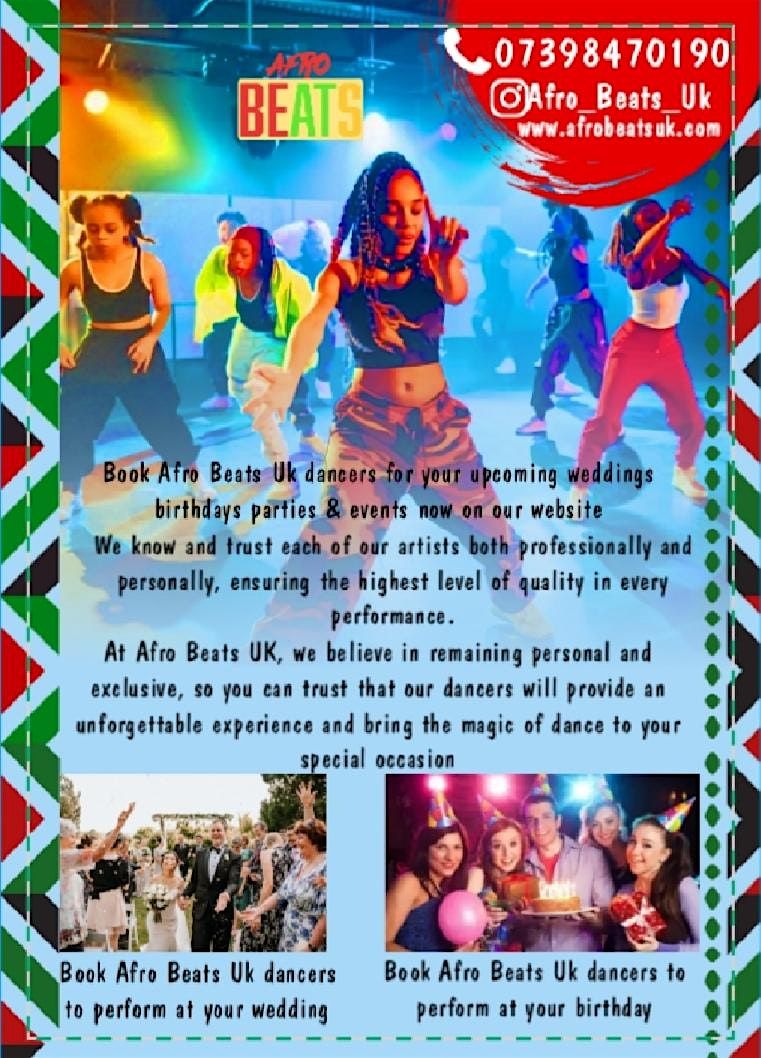 Book Afro Beats dancers to perform at your birthday, wedding or event_ Call 07398470190