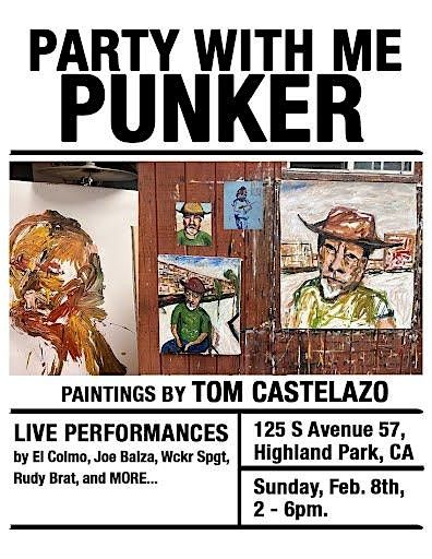 A flyer for the "Party With Me Punker" art project - a series of portraits painted of various musicians in Southern California by artist Thomas Castelazo. This event takes place from 2-6pm on February 8th, 2026 and features musical performances from many of the included artists, as well as the artwork that was produced. All ages are welcome.