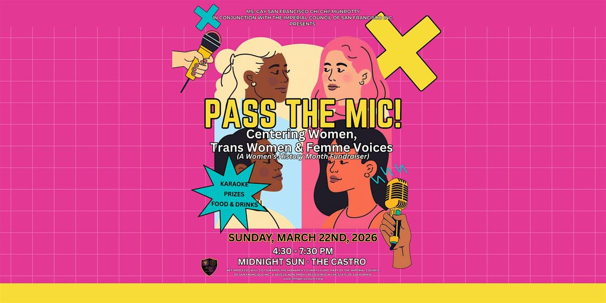 Pass the Mic is hosted by Chi Chi, Miss Gay San Francisco, in partnership with the Imperial Council of San Francisco, with proceeds benefiting the Monarch’s Charity Fund.