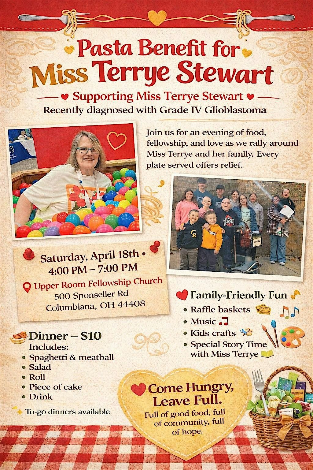 Join us for yummy pasta, good music and some kid friendly fun to raise funds for a great cause. Miss Terrye is a beloved Preschool teacher in the Columbiana County area diagnosed with Grade 4 Glioblastoma. Miss Terrye has not been able to work since being diagnosed. We are raising funds for medical bills and her bucket list to enjoy with her family!