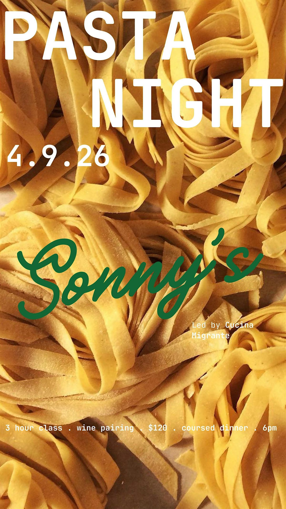 Event location: Sonny's Pizza. Start time: 6:00 pm; end time: 9:00 pm. Arrive on time to participate in the full hands-on class and dinner.
