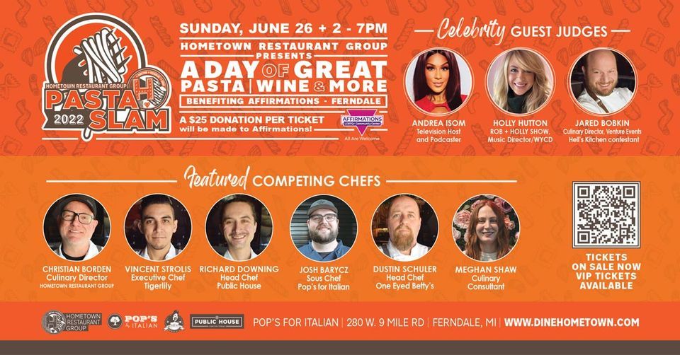 Each ticket purchased includes six unlimited pasta dishes, appetizers, salad and dessert, and a welcome gift bag with a chance to win unique prizes, including a 75-inch television, family memberships to the Detroit Zoo; a $250 gift basket from Reid Salon; and gift cards to local Ferndale businesses. Activities will include meeting our chefs, sommelier consulting, 360-degree photo booth and sampling dishes from Pops for Italian's menu. Tickets are $100 per person, with $25 of each ticket donated to Affirmations LGBTQ+ community center.