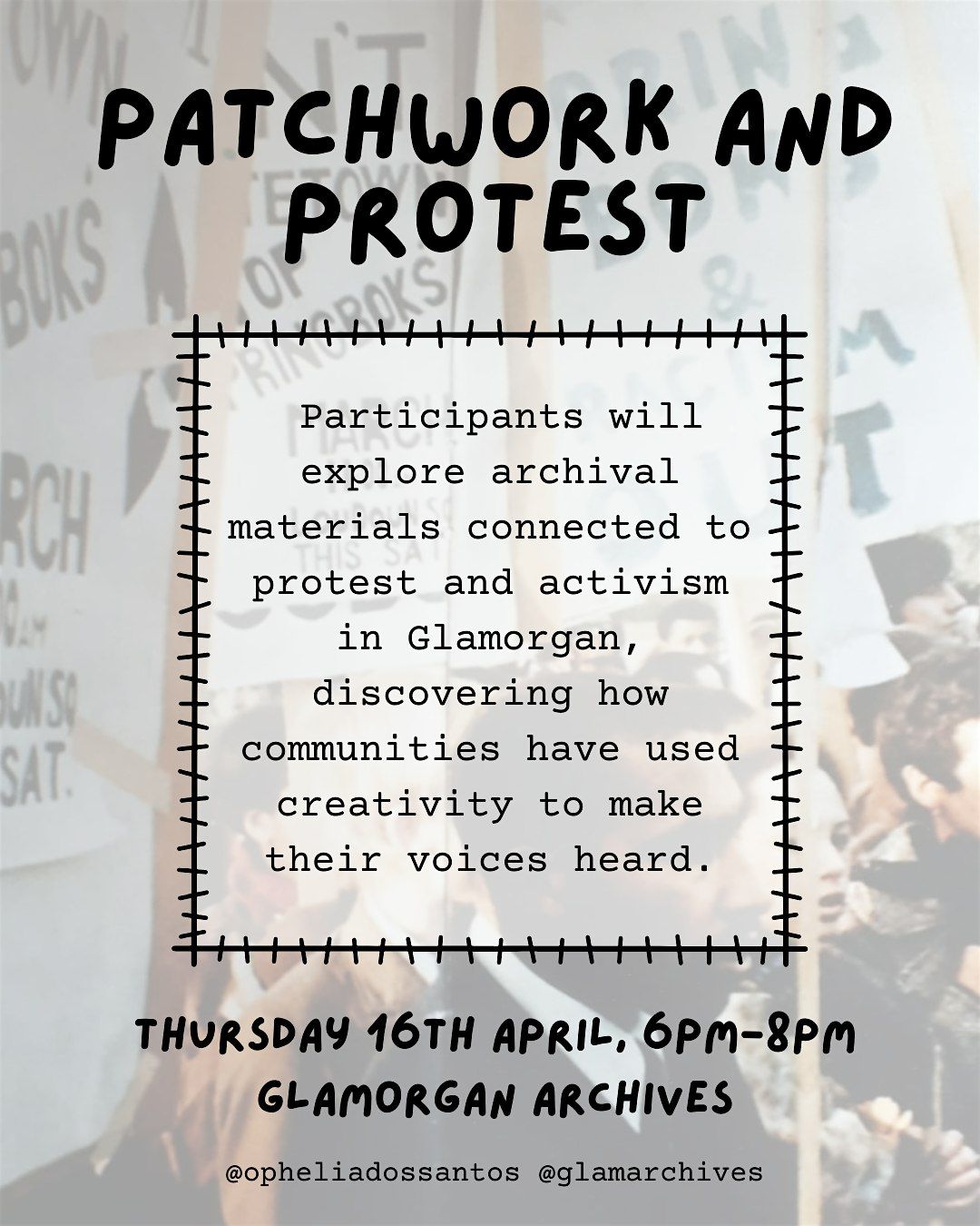 Textiles have long played a role in movements for social change - from hand-stitched banners and protest flags to quilts that carry messages of solidarity and resistance. In this workshop at Glamorgan Archives, participants will explore archival materials connected to protest and activism in Glamorgan, discovering how communities have used creativity to make their voices heard.