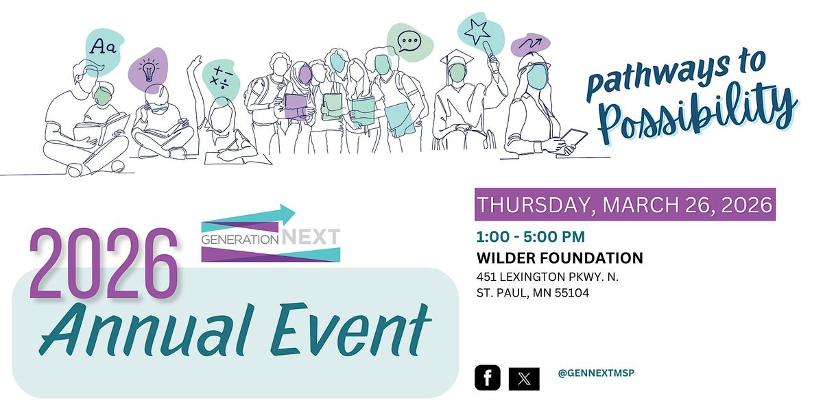 Join Generation Next and our partners for our 2026 Annual Event: Pathways to Possibility! Hosted at Wilder Foundation on March 26, 2026 from 1-5 PM, this event will feature a Data Walk on our priority & goal areas, hearing about the state of our scholars in Minneapolis and Saint Paul, collaborative work around the Learning Journey, and time for connection, networking, and holding space.
