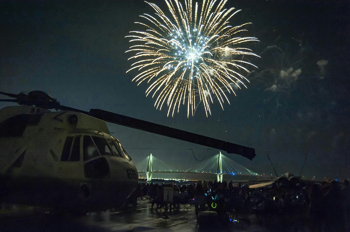 Your ticket includes access aboard the Yorktown, live music, a 20+ minute fireworks show over Charleston Harbor, and family-friendly fun throughout the evening.