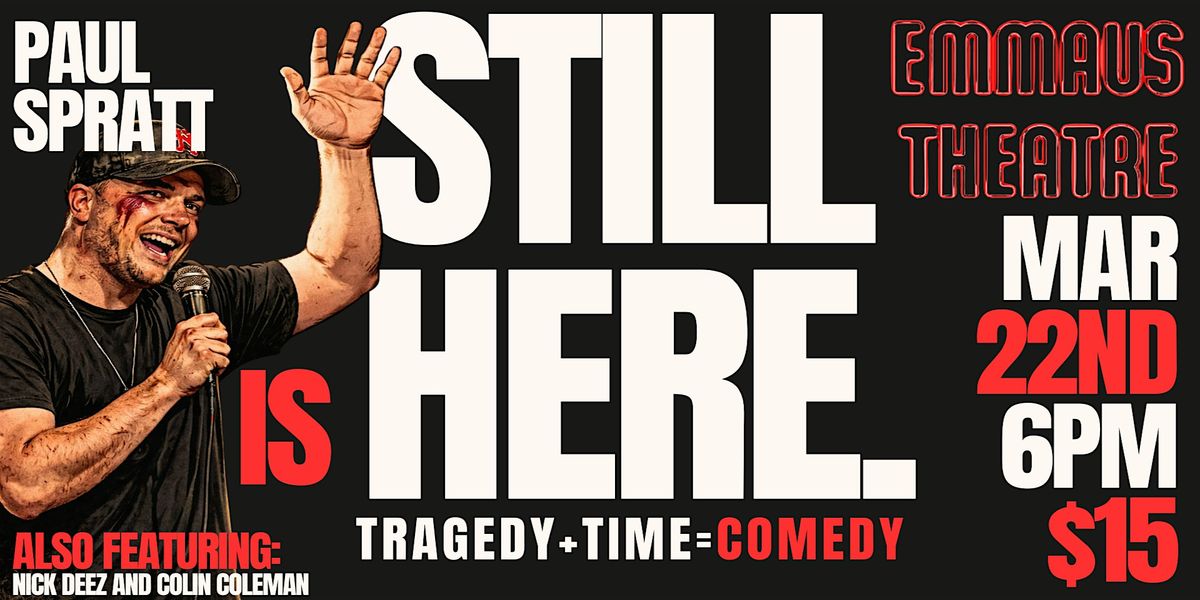 Paul Spratt brings his Still Here Tour to the Emmaus Theatre with a brand-new hour of comedy drawn from hard lessons, strange detours, and those moments you only realize are funny later. Sharp, honest, and relentlessly entertaining, Paul’s stand-up moves seamlessly between dark corners and big laughs.