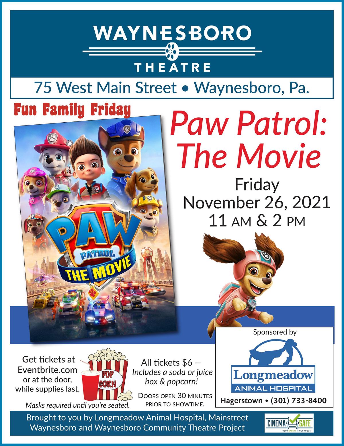 No jobs too big, no pups too small to celebrate "fun family Friday" at the Waynesboro Theater on Friday, November 26 at 11 am or 2 pm showing. $6 tickets, include a soda or juice box and unlimited popcorn. Thanks to our sponsor Longmeadow Animal Hospital.