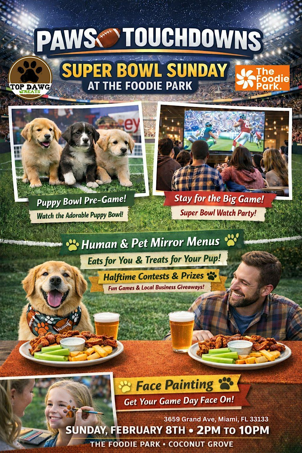 #PawsAndTouchdowns #FoodiePark #SuperBowlSunday #TopDawgTreats #CoconutGrove