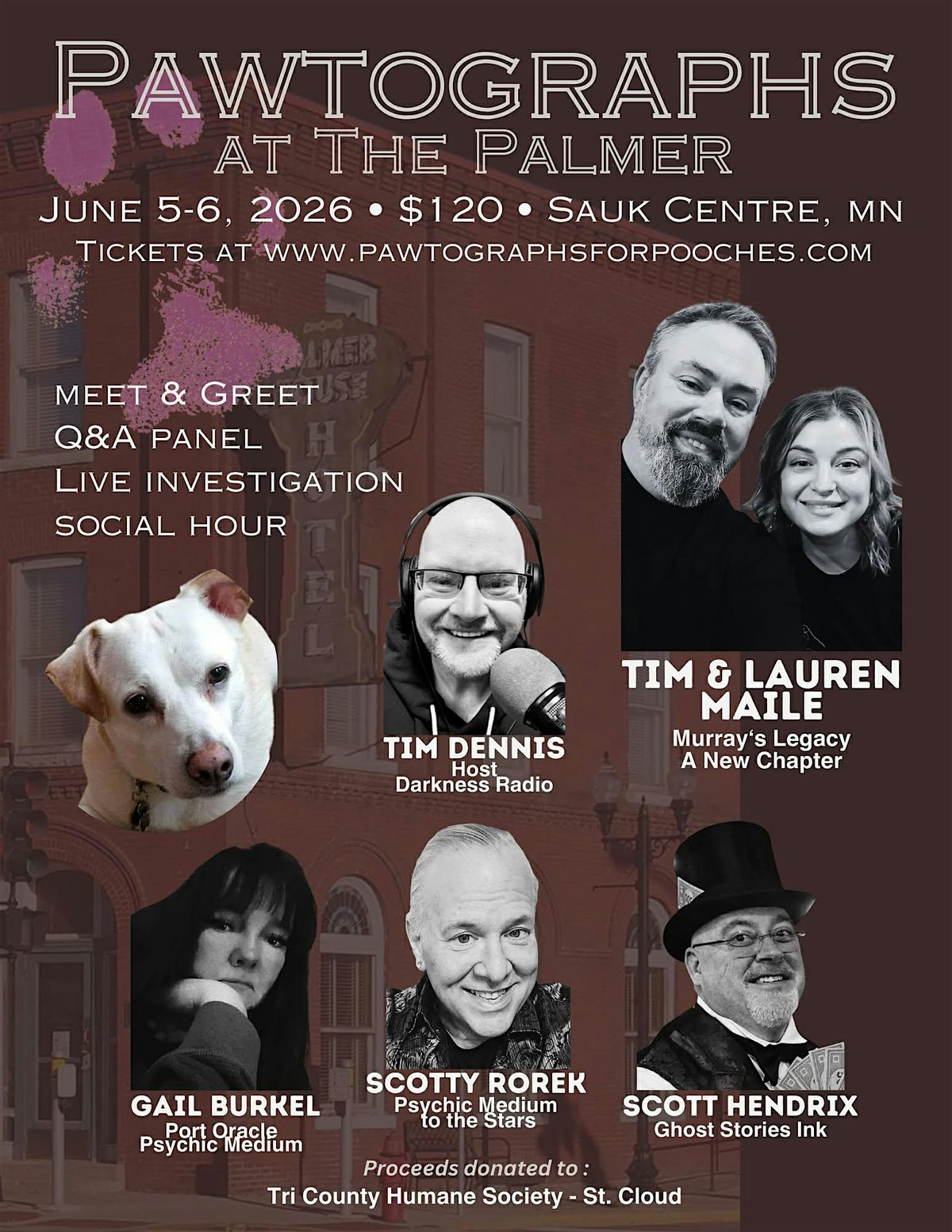 Join Tim and Lauren Maile from Pawtographs for Pooches, along with some of their very good friends for a weekend of paranormal fun all in the name of raising money for the animals! Each night begins with a Q&A at 6pm, followed by a parnormal investigation of the Palmer House until 11! We will finish up both nights with a social hour and lots of laughter! Only 20 tickets available! This is a very limited event! Don't miss out!
