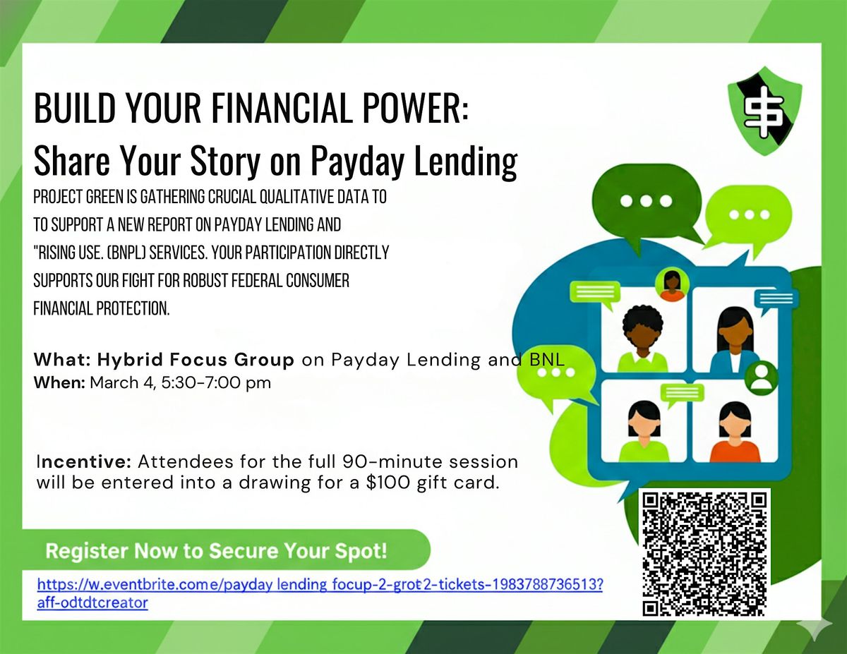 To register for virtual: https://www.eventbrite.com/e/payday-lending-focus-group-2-tickets-1983788736513?aff=oddtdtcreator