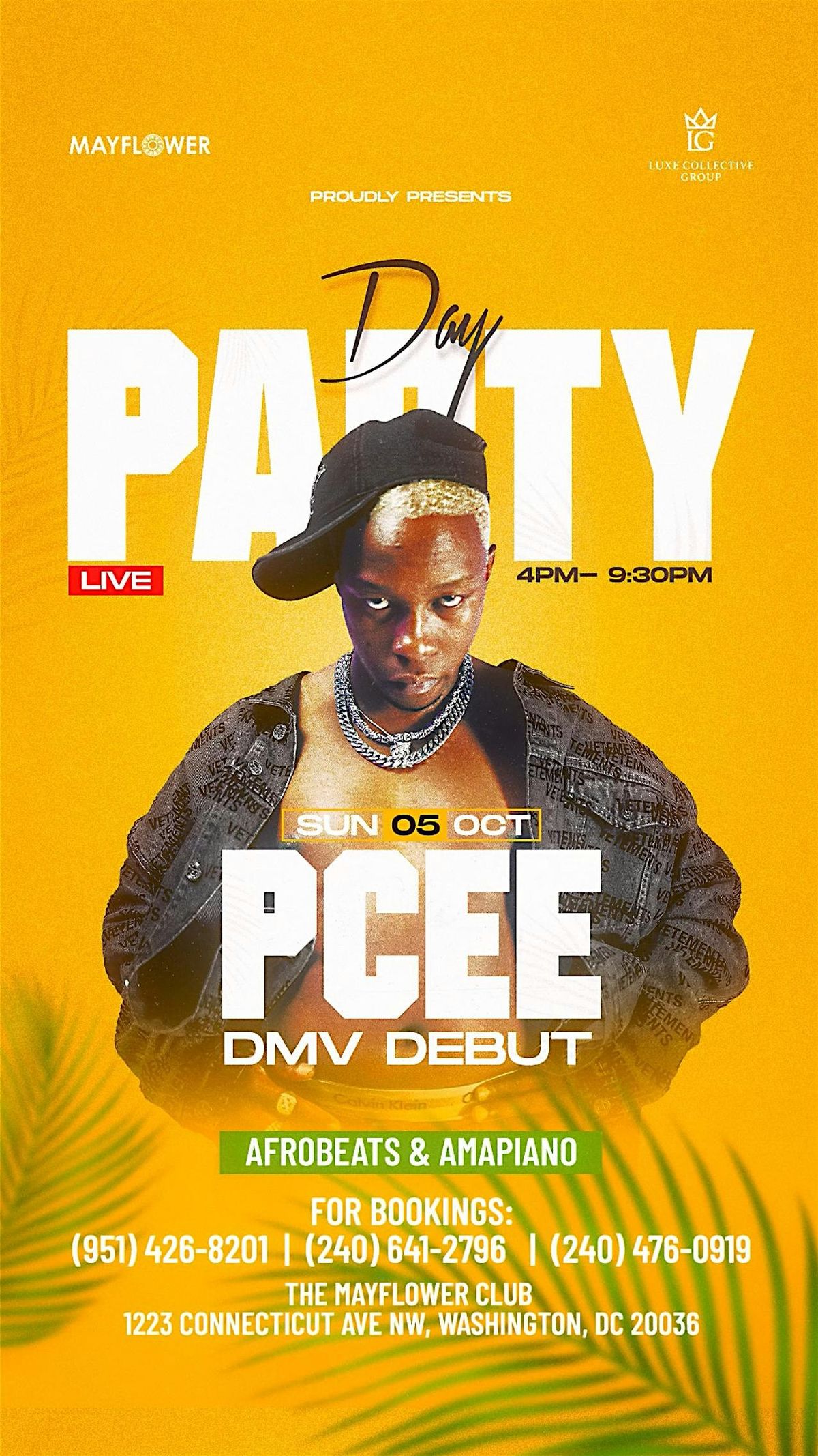 Welcome to the ultimate Amapiano Takeover by Luxe Collective Group! 🎶 Join us for Pcee's first time in DC, get ready to dance the night away with the hottest Amapiano artist at The Mayflower Club on October 5, 2025 at 4:00 PM (Eastern Time). Get ready to dance the day away to the hottest beats and vibes. Don't miss out on this epic event! See you there! 🔥🎉
