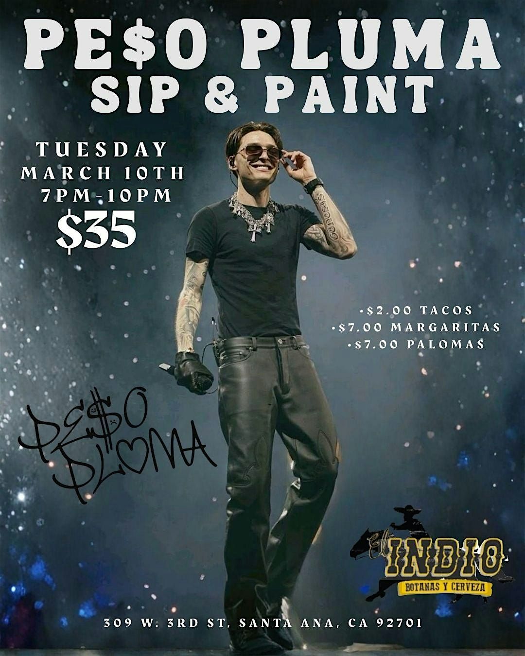 Pull up Tuesday, March 10th from 7PMโ10PM for a night dedicated to the one and only Peso Pluma ๐ฅ Weโre painting the Mexican icon himself while singing our hearts out to all his biggest hits. If you know the lyrics, you better be ready to scream them ๐๐ค