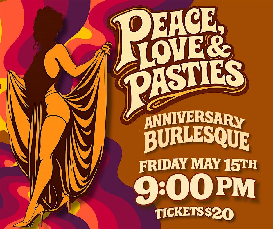 Join us for “Peace, Love & Pasties,” an anniversary burlesque show celebrating a night of live performance and entertainment. Expect a dynamic lineup, great energy, and a fun atmosphere from start to finish. The show kicks off Friday, May 15th at 9:00 PM. Tickets are $20—come celebrate with us.