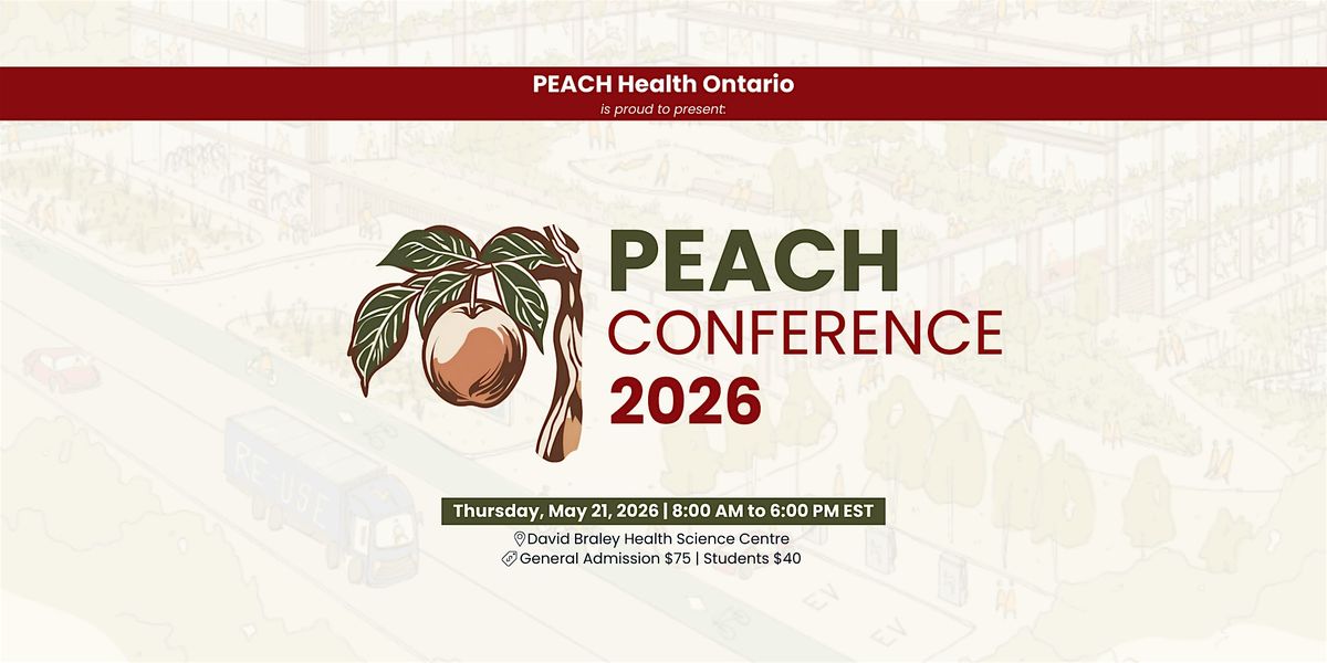 Welcome to the second PEACH Health Conference 2026. Join us for an exciting in-person event at the David Braley Health Sciences Centre on Thursday, May 21, 2026 from 8:00 AM - 6:00 PM where you can connect with and learn from experts in sustainability, Planetary Health, Family Medicine, and Knowledge Translation. Don't miss this opportunity to network, learn, and grow with students and professionals in the field!