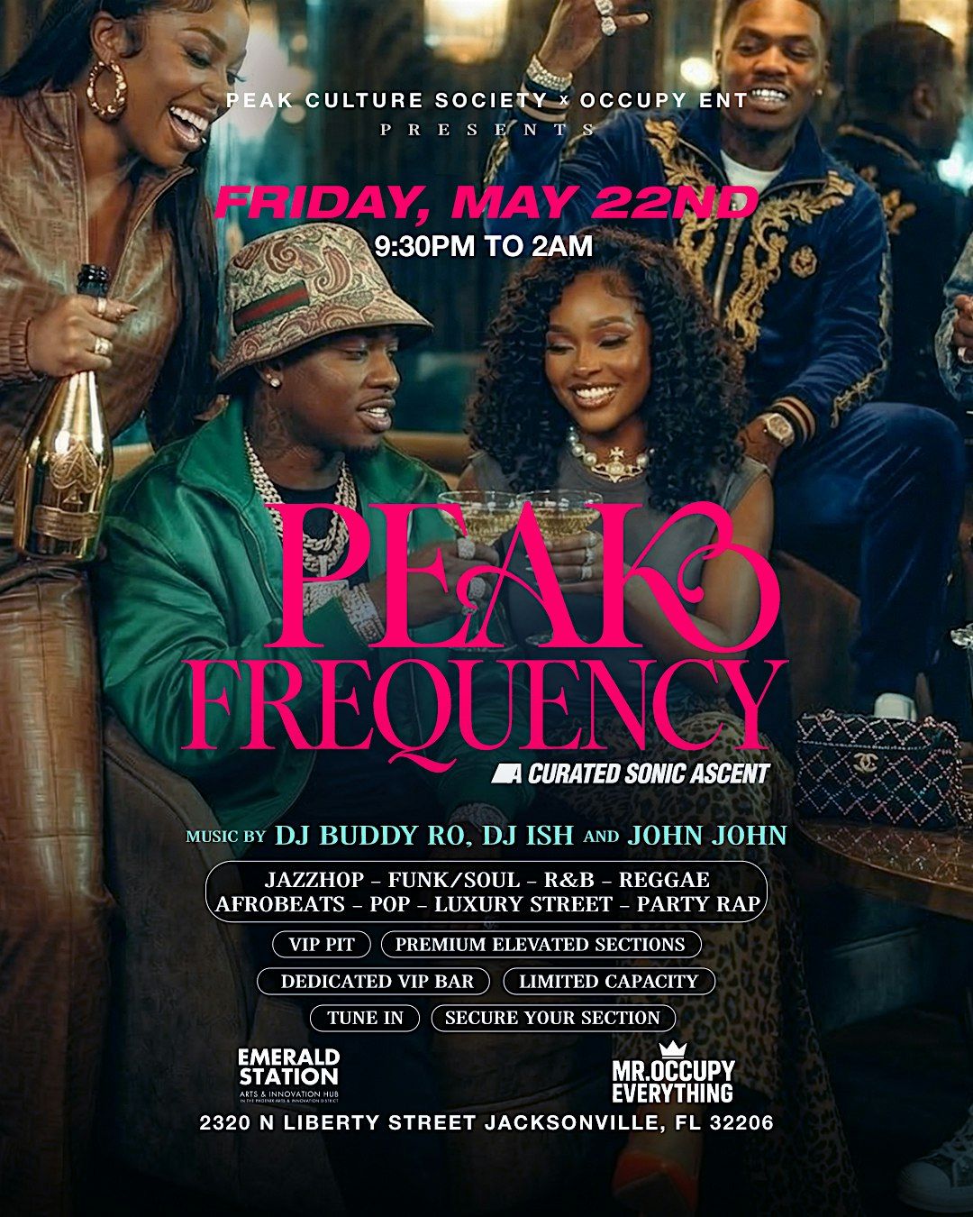 DJ Buddy Ro & DJ ISH spinning. Semi Upscale Party. Peak Frequency is a curated cultural experience where music, energy, and people align at their highest level. It moves intentionally through a spectrum of sound—blending jazzhop, R&B, afrobeats, reggae, luxury street, and EDM—to build toward a shared peak moment. The event is designed around progression, with each phase elevating the crowd’s energy rather than relying on randomness. Presented by Peak Culture Society and Occupy Ent, it combines intentional sound, elevated environments, and immersive social experiences. Whether day or night, Peak Frequency is not just a party—it’s a transmission of culture, rhythm, and connection.