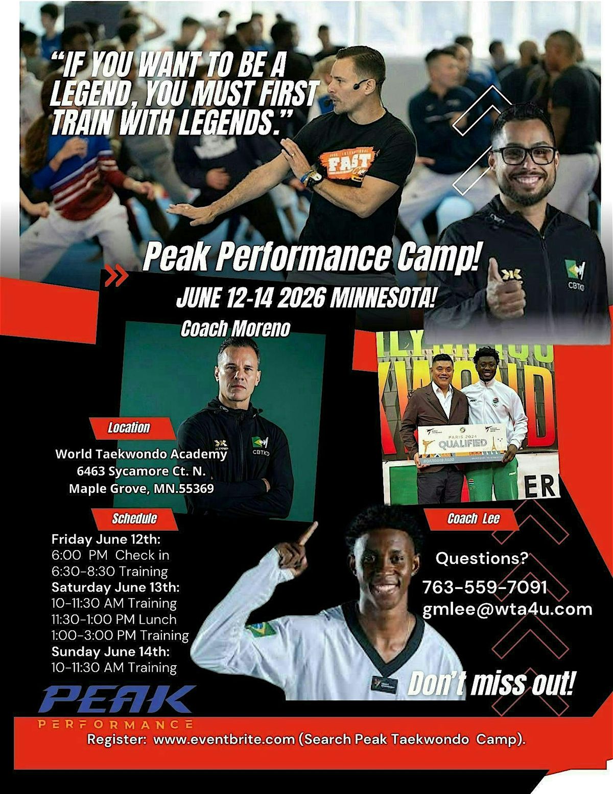 Get ready to kick it up a notch at the Peak Taekwondo Camp! Join us in person at 6463 Sycamore Ct N on June 12, 2026 at 6:00 PM (Central Time). Whether you're a beginner or a pro, this camp is perfect for sharpening your skills and having a blast with fellow martial arts players. Donβt miss out on this awesome opportunity to learn, train, and have fun! All participants/parents/guardians must sign a waiver at check in time. Thank you