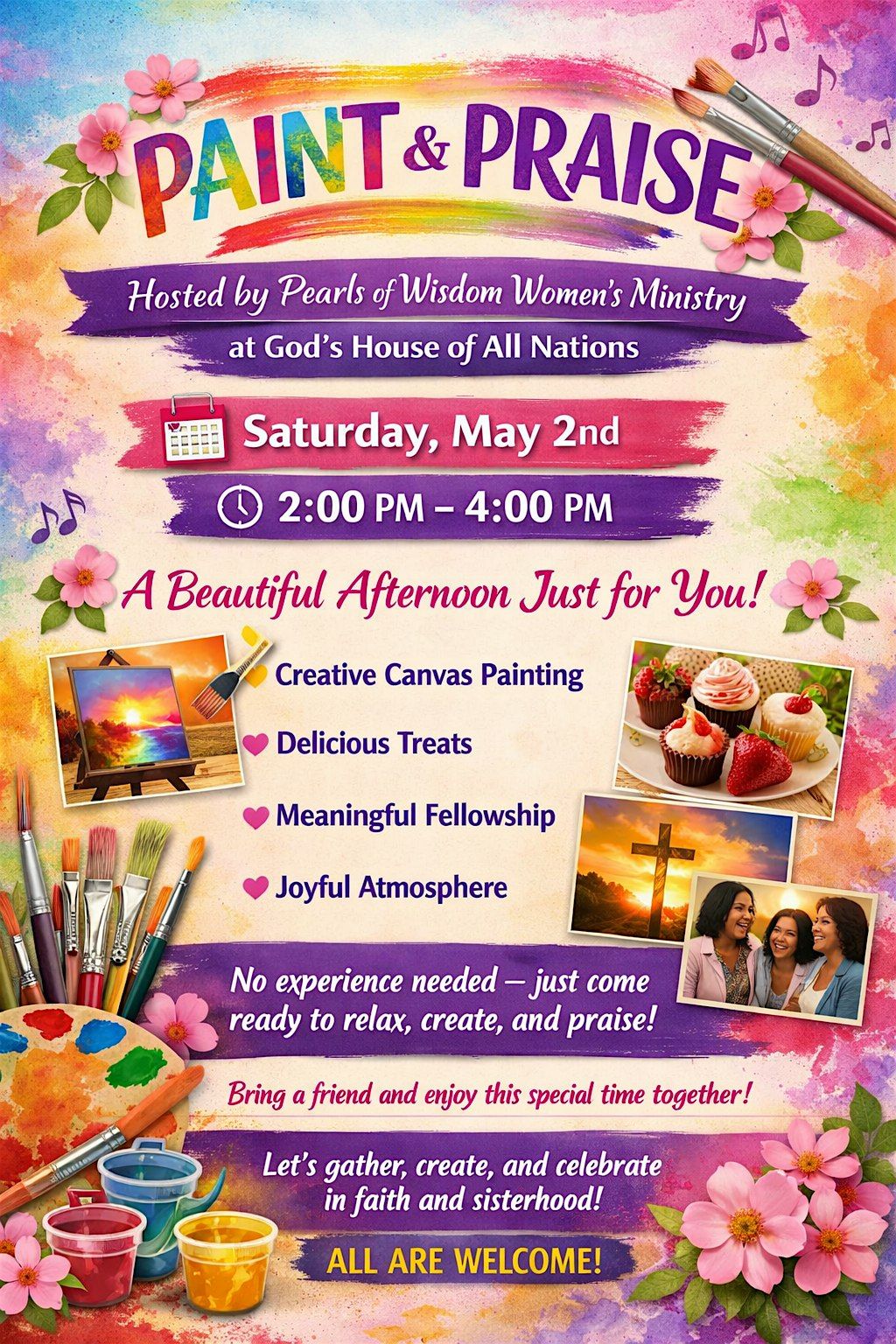 Join us for a beautiful time of creativity and connection at God’s House of All Nations’ Paint and Praise event, hosted by the Pearls of Wisdom Women’s Ministry on May 2nd from 2:00 to 4:00 p.m. This special gathering invites women to come together to paint a canvas, enjoy delicious and delectable treats, and experience heartfelt fellowship in a warm, uplifting atmosphere. Whether you’re an experienced artist or just looking to try something new, this event is the perfect opportunity to relax, express yourself, and bond with other women in faith and joy. We look forward to sharing this meaningful and inspiring time with you!