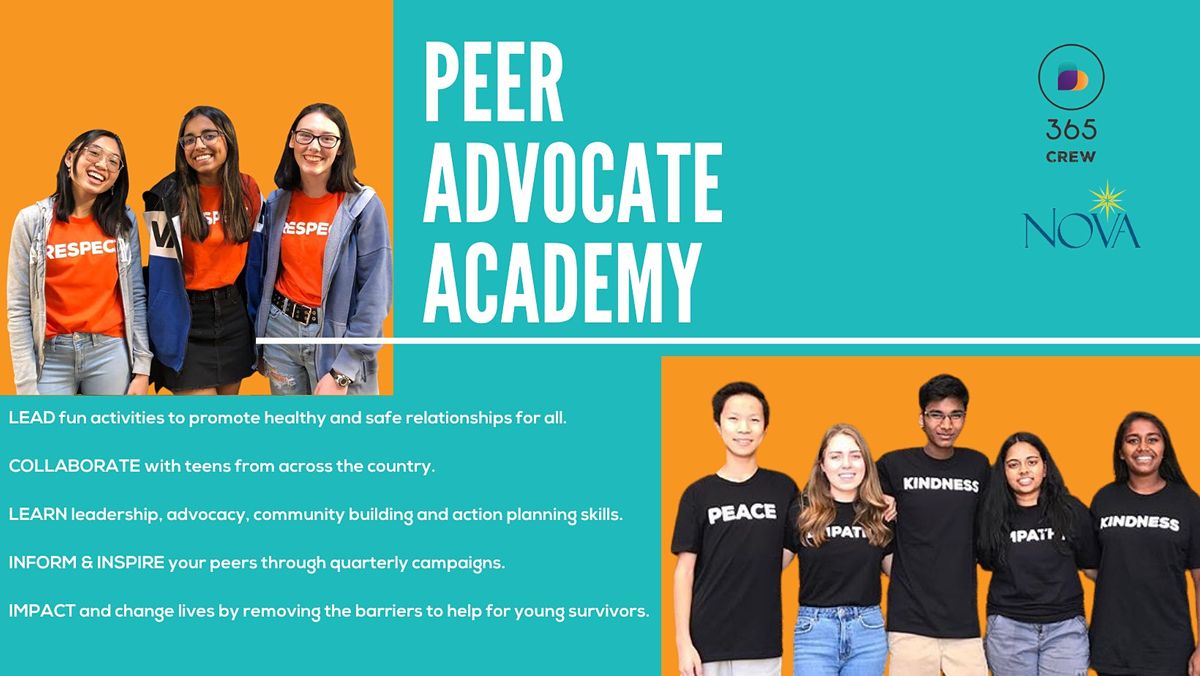 The Peer Advocate Academy TEEN TRACK at the NOVA Conference is a three-part EDUCATE, ADVOCATE, ACTIVATE training experience for young people ages 13 - 18 to gain knowledge and practical skills to promote healthy relationships on campuses and in communities across the U.S. This academy is led by peers for peers with the goal of increasing healing, safety and support for Gen Z youth impacted by interpersonal violence.