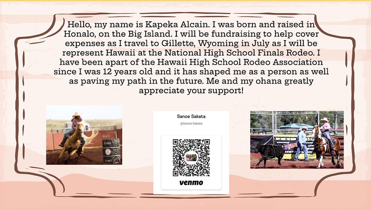 Hello my name is Kapeka Alcain. I am from Kona on the Big Island. I am a graduating senior at Konawaena High School and rodeo isn’t only my passion but has become my livelihood. I will be headed to Gillette, Wyoming in July to compete in the National High School Finals Rodeo from the 16th-22nd. I will also be taking my equine partner, Tobi, with me to compete. I would greatly appreciate the financial support for my horse, my family and myself to cover expense as we travel and stay in Wyoming. Come down for some unique ono pizza along with kombucha on tap.