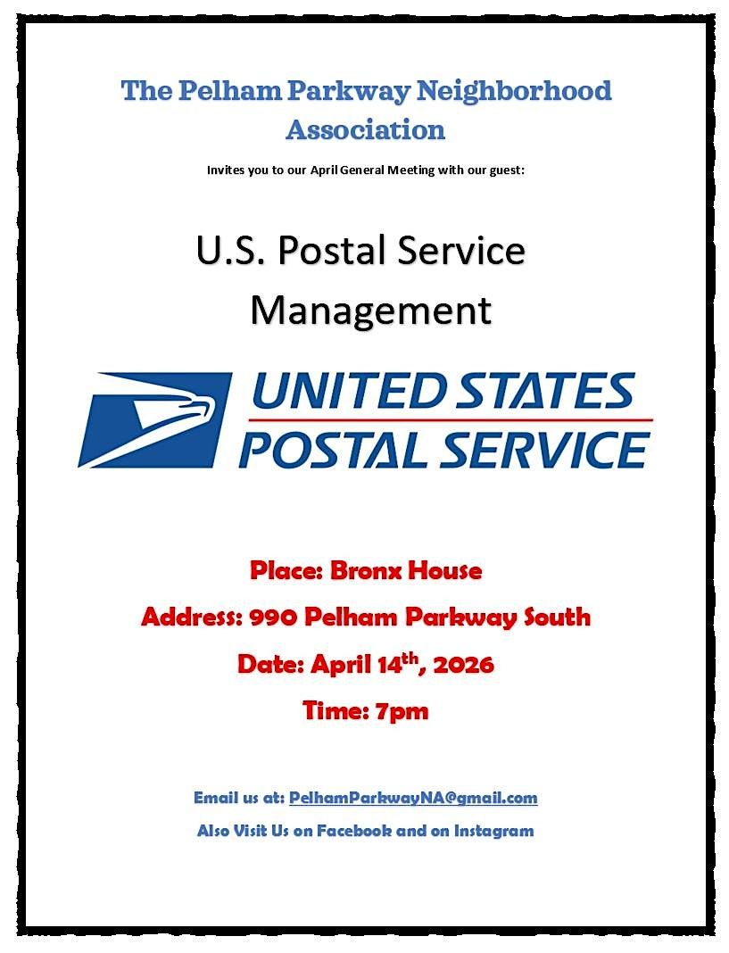 The PPNA General Community meeting on Tuesday April 14th at 7:00 pm with special guests Senior Mgmt. from the US Postal Service.