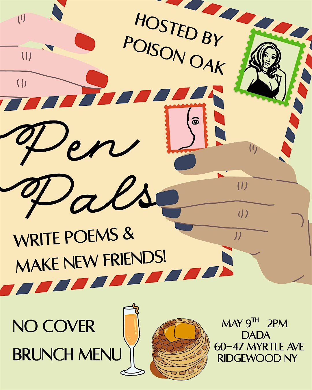 During this social mixer, you will co-write poems with friends both old and new. Pen Pals is hosted by drag poet Poison Oak. She will guide you through writing short poems that you co-author with other people. Guests will then be invited to share their writing on the mic. Enjoy DADA's select cocktails and brunch menu as you and your pen make a pal!
