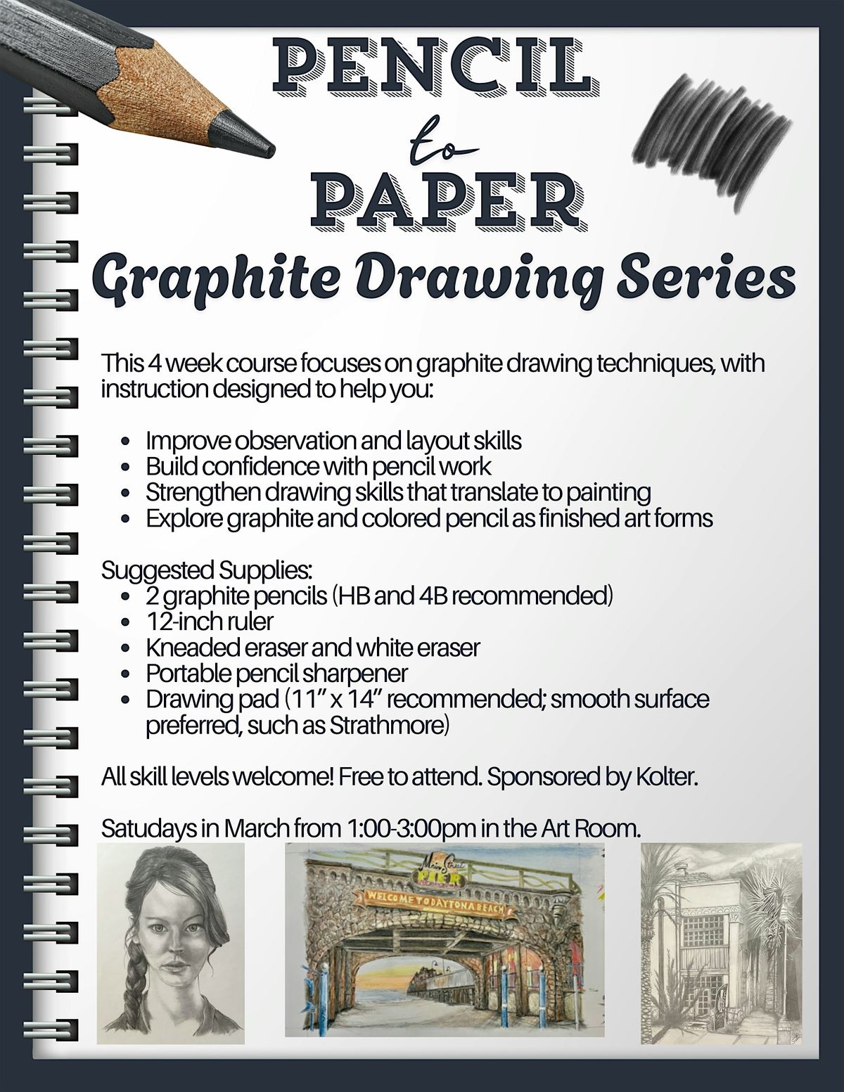 This 4 week course focuses on graphite drawing techniques, with instruction designed to help you: