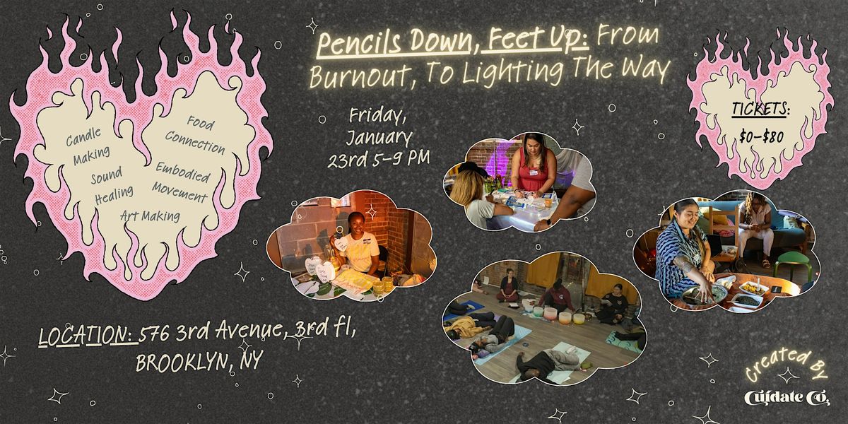 Pencils Down Feet Up, is a Collective Restoration & Wellness Event Series organized by Cuidate Collective & friends! It is created by, and for educators, healers, mental health providers, specifically our BIPOC & LGBTQAI+ folks that are working towards our collective liberation.