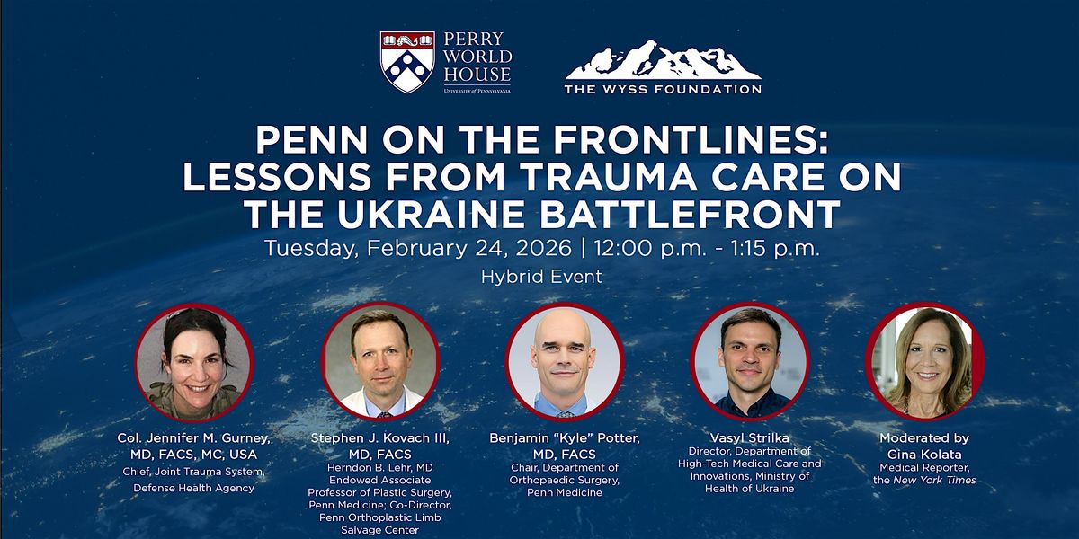 On the anniversary of Russia’s invasion of Ukraine, join Perry World House and the Wyss Medical Foundation for an urgent conversation with military trauma surgeons and strategic experts working to save lives on the frontlines of this war.
