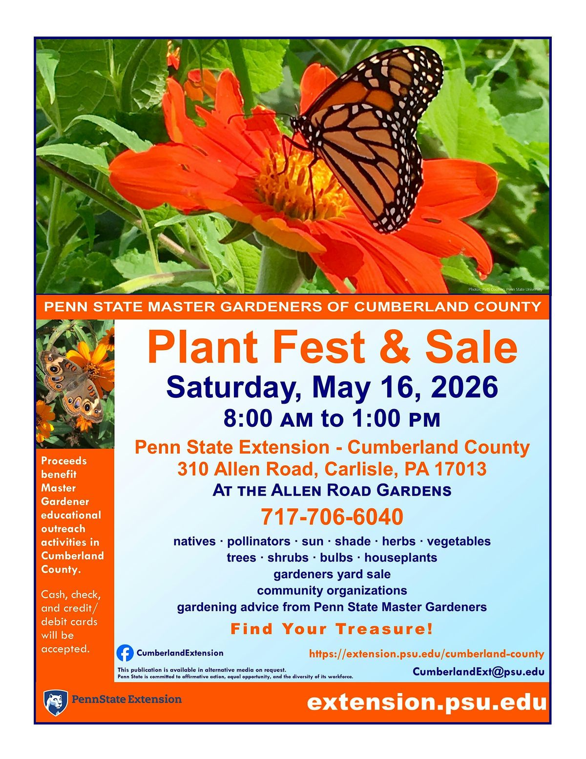 Cash, checks, and credit/debit cards will be accepted. Proceeds benefit the Penn State Extension Master Gardener program in Cumberland County. Bring your own wagon/cart to transport plants. Get your spring planting off to a great start by coming to Plant Fest!