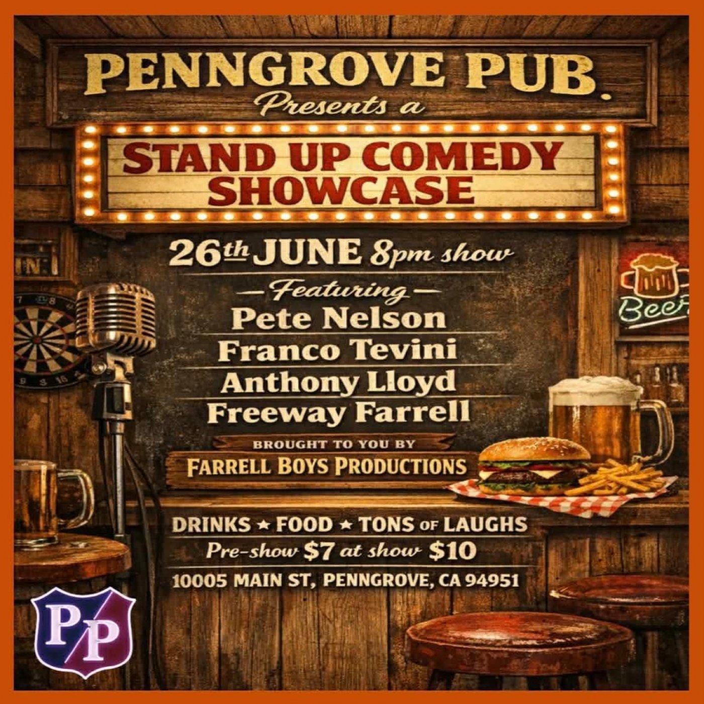Indulge in a night of uproarious laughter at the Penngrove Pub Stand-up Comedy event presented by Farrell Boys Productions. Get ready to roll with laughter as talented comedians take the stage, promising an evening filled with side-splitting humor and comedic brilliance.