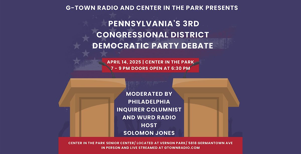 Join G-Town Radio and Center in the Park for the Pennsylvania 3rd Congressional District Democratic Party Debate on Tuesday, April 14th. Moderated by Philadelphia Inquirer Columnist and WURD Radio Host, Solomon Jones. This important community event brings candidates together for a live discussion on the issues that matter most.