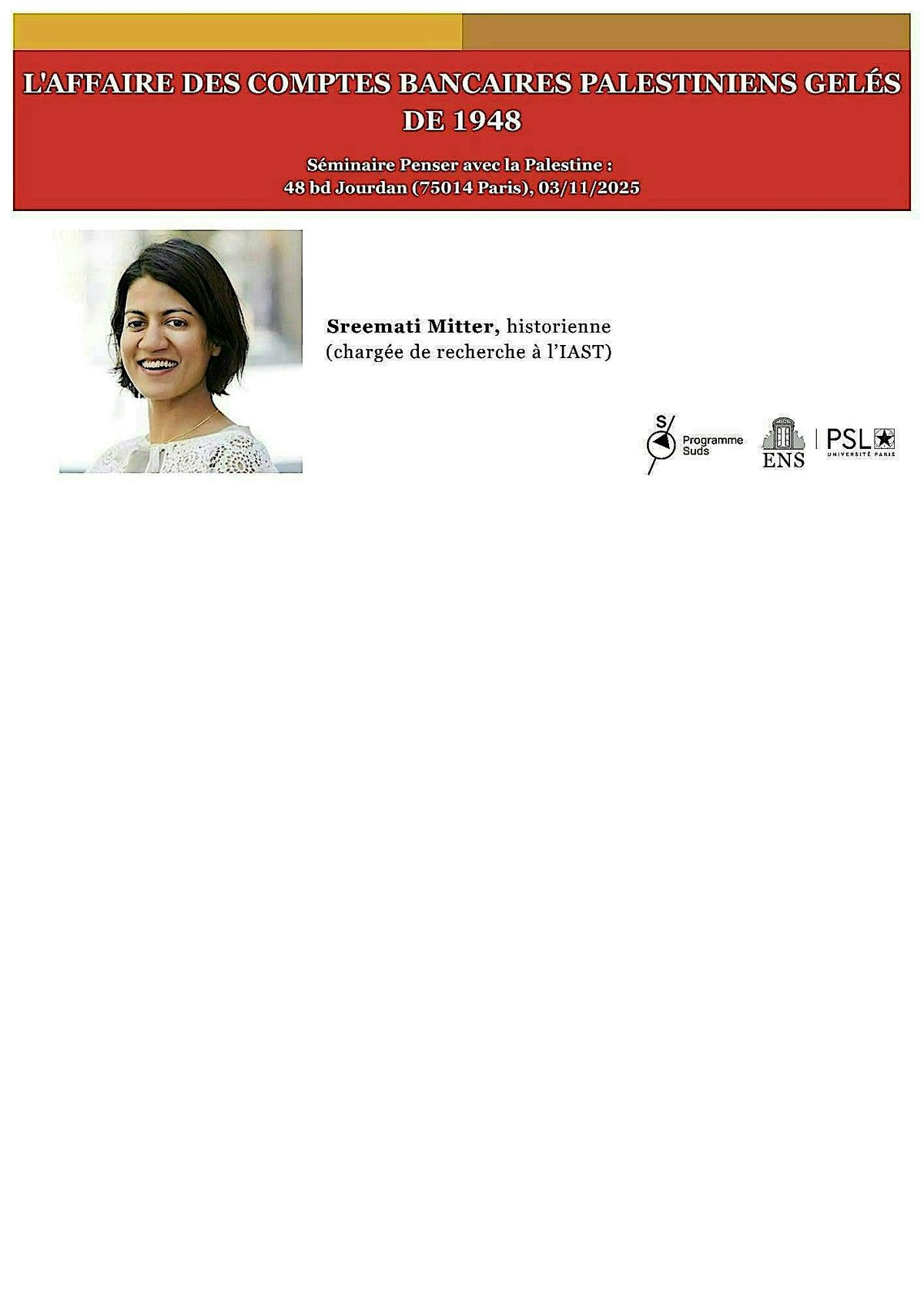 Sreemati Mitter est docteure en histoire de l’Université Harvard depuis 2014. Elle est actuellement chercheuse à l’IAST de Toulouse, où elle travaille sur l’histoire économique et financière du Moyen-Orient moderne. Ses recherches portent en particulier sur la Palestine, de l’époque ottomane à la création de l’État d’Israël en 1948, avec un intérêt pour l’expropriation des biens financiers palestiniens. Sreemati Mitter a notamment travaillé au Palestine Investment Fund (PIF) à Ramallah.