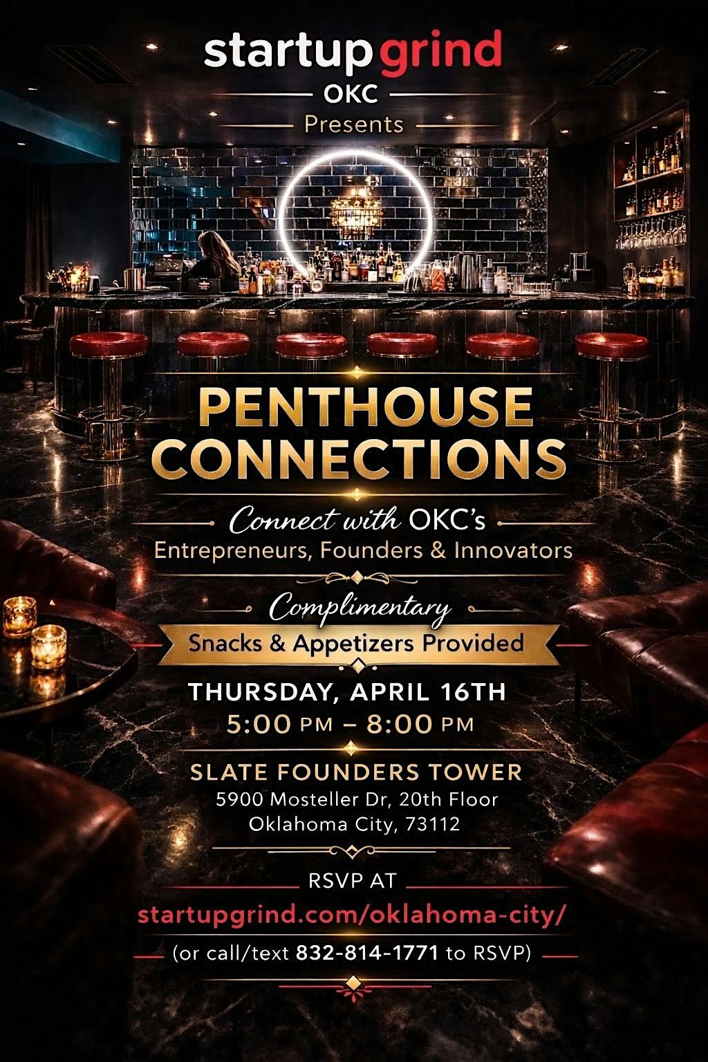 To RSVP go to See Penthouse Connections - Happy Hour at Slate Tower at Startup Grind Oklahoma City or text (832) 814-1771 to get your tickets!