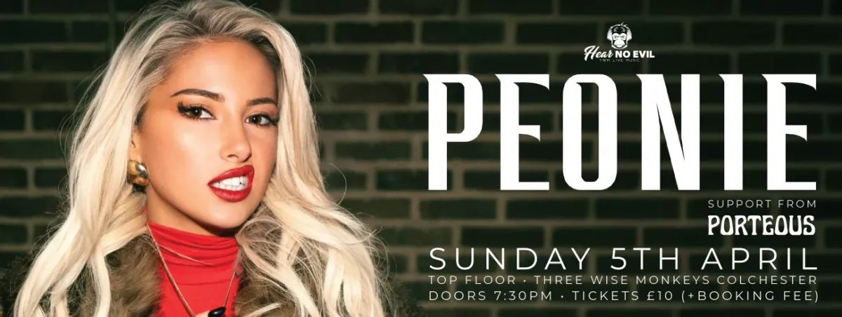 TWM Live presents Peonie, performing live at Three Wise Monkeys, Colchester, with support from Porteous.Peonie, from Essex, blends Jazz, Pop and Hiphop. She has headlined Ronnie Scottβs and performed at festivals including Latitude and All Points East. Influenced by Queen, Amy Winehouse and Lauryn Hill, she is currently working on new projects with her band, encompassing themes of love and loss.Date: Sunday, 5 AprilVenue: Three Wise Monkeys, ColchesterTickets: Β£10Doors: 7:30pmAges: 18+Please note that access to the top floor of Three Wise Monkeys does not have a lift, but there are rest opportunities between each flight of stairs.Viewer discretion is advised: This show may potentially contain flashing and strobing lighting effects.Refund policy: We are unable to process any ticket refunds within 7 days of the event.