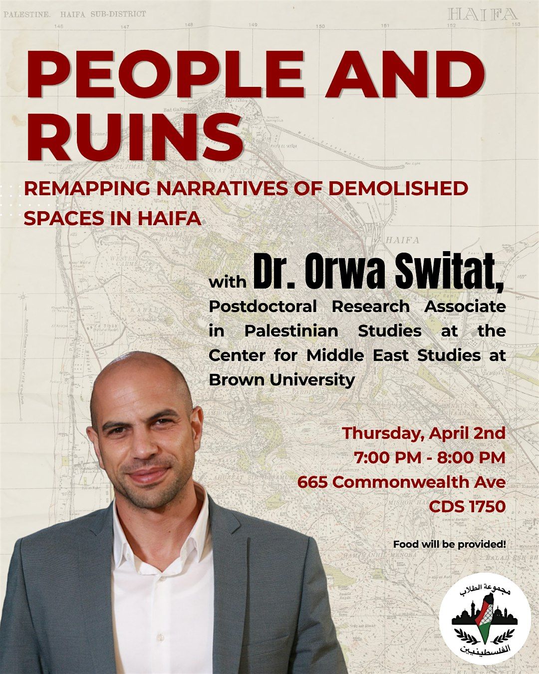 Dr. Orwa Switat, a Postdoctoral Research Associate in Palestinian Studies at Brown University, presents a digital mapping project that reconstructs the displaced Palestinian urban heritage of Haifa through historical maps, Indigenous archives, oral histories, and film. The event includes a map demonstration and screenings of short films.