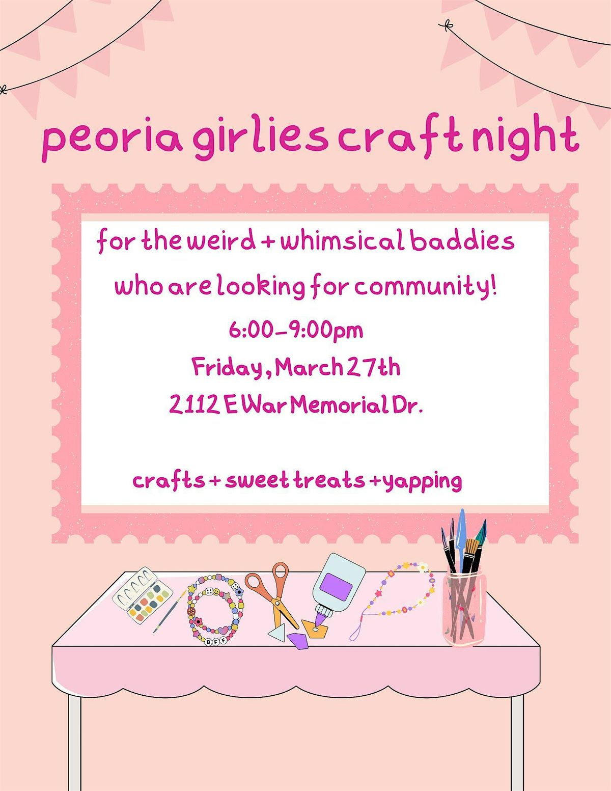 peoria girlies craft night is a cozy, low-pressure space to relax, be creative, and meet new people. we’ll be making diy phone charms, collages, and bedazzled items together. it’s perfect for shy or introverted attendees who want something social without loud party energy. come unwind, have sweet treats, yap, and leave with cutie pieces you made.