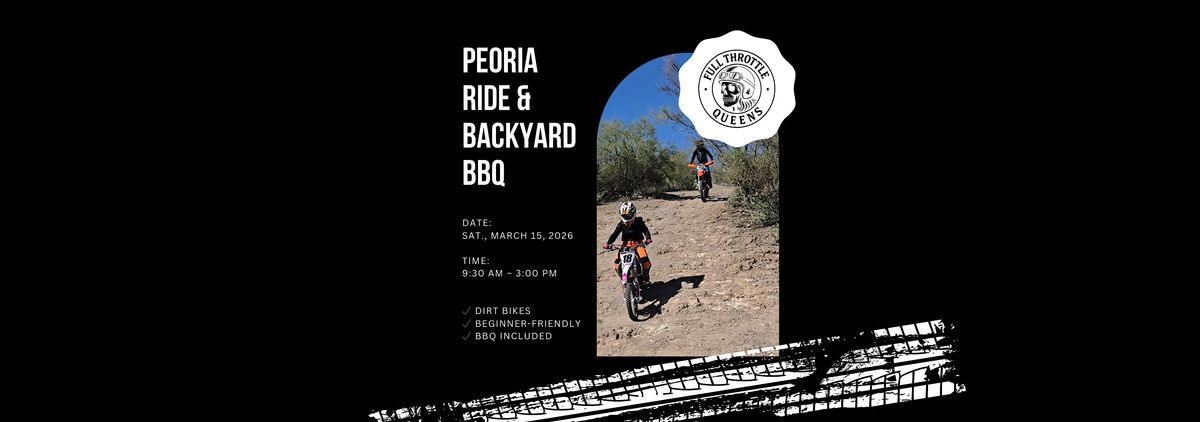 Join us for a women-only dirt bike ride in Peoria, followed by a laid-back backyard BBQ at a fellow Full Throttle Queen’s home. We’ll start the day on the bikes, riding local desert trails at a supportive, confidence-building pace, then finish by pulling helmets off, grabbing a burger, and hanging out like friends.