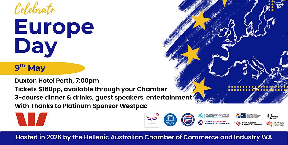 To celebrate Europe Day 2026, we are excited to invite you to the inaugural European Australian Chambers' Dinner, in Perth WA.