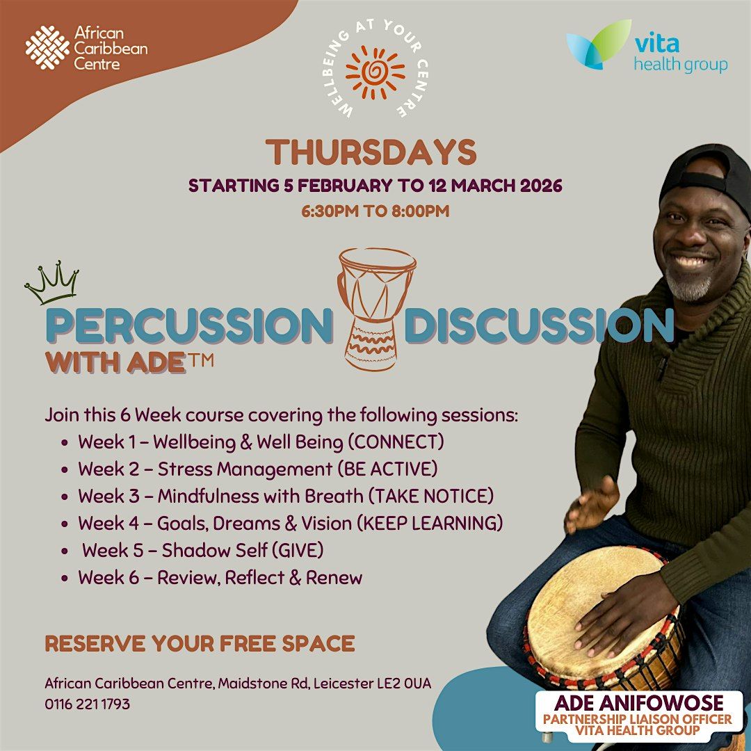 Join us for Percussion Discussion, a free 6-week wellbeing course led by Ade Anifowose at the African Caribbean Centre. Using rhythm, reflection and guided discussion, this course supports emotional wellbeing, stress management and personal growth, grounded in the Five Ways to Wellbeing.