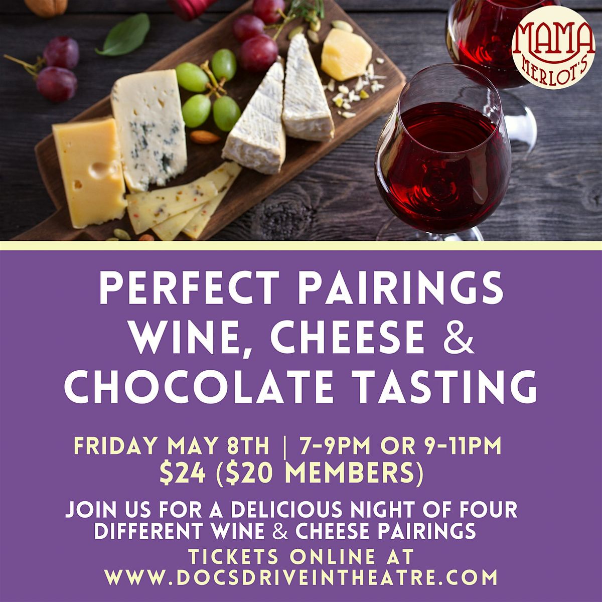 Join us at Mama Merlot's Speakeasy on May 8, 2026 at 17pm or 9pm for a fun and relaxed tasting experience! Discover the perfect combos of wine, cheese, and chocolate in a cozy, laid-back vibe. Whether you’re a foodie or just looking for a good time, this event is your ticket to delicious pairings and great company. Don’t miss out on this tasty adventure!