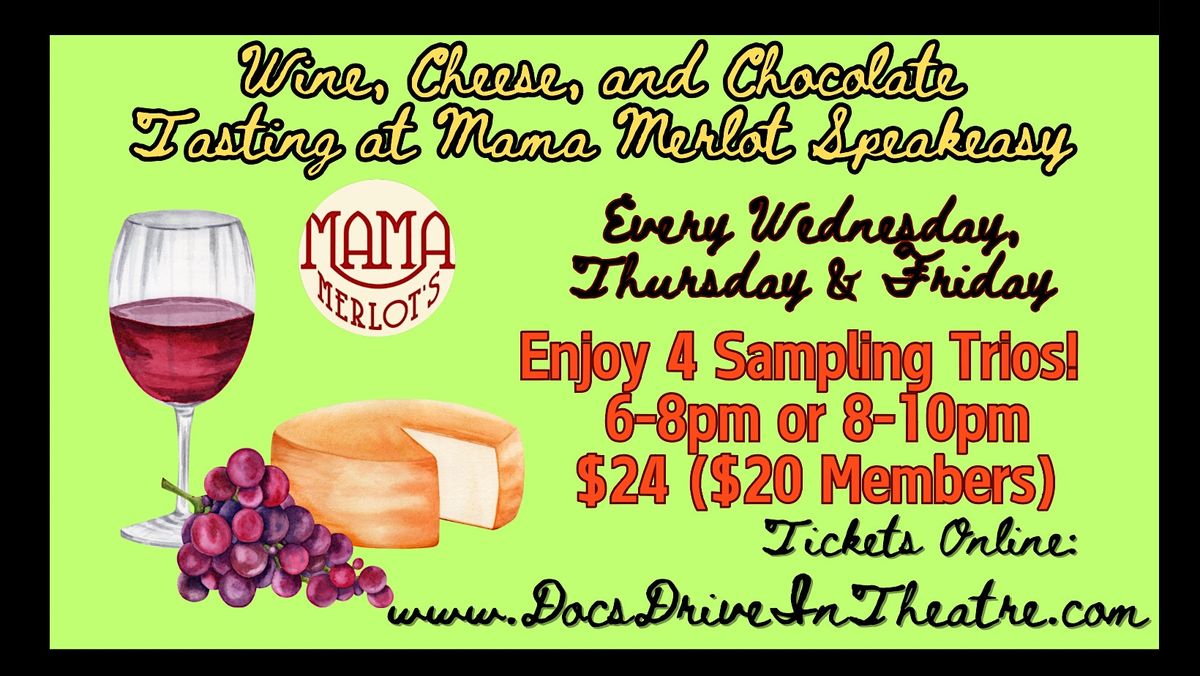 Welcome to Mama Merlot's Speakeasy for a delightful event: Perfect Pairings: Wine, Cheese & Chocolate at the Speakeasy! Join us every Wednesday, Thursday & Friday from 6-8om or 8-10pm and treat yourself!