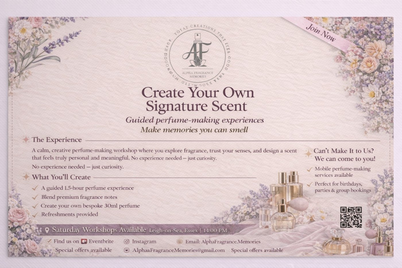 You’ll learn about fragrance notes, train your nose, and experiment with carefully selected scents before blending and bottling your own bespoke perfume to take home. No prior experience is needed — just curiosity and a love for creativity.