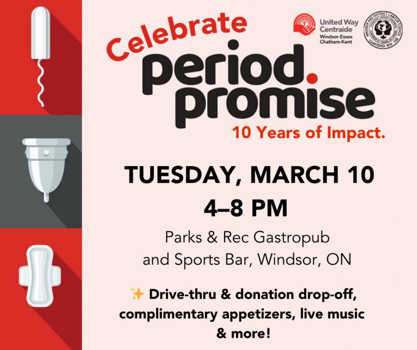 Join United Way Centraide Windsor-Essex Chatham-Kent and the Windsor & District Labour Council at Parks & Rec Gastropub and Sports Bar for Period Promise (formerly Tampon Tuesday)!