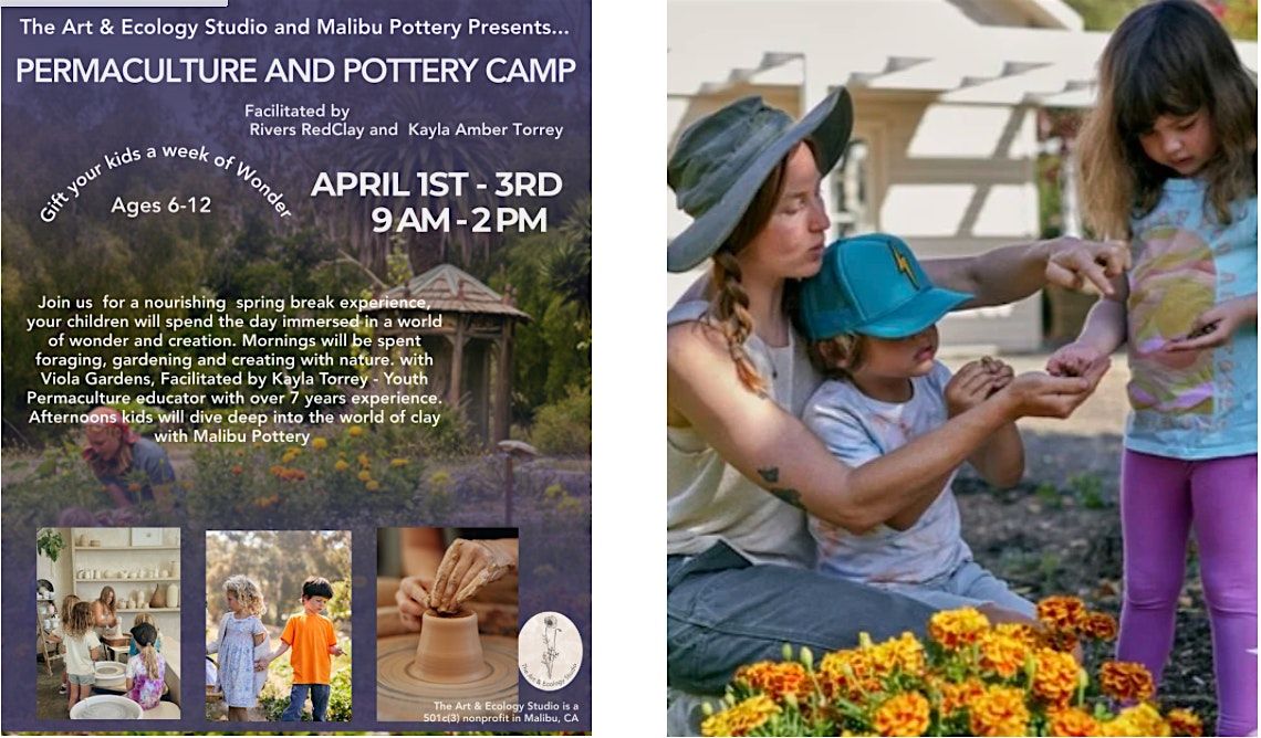Welcome to our exciting spring break program for kids ages 6-12! Get ready for a creative adventure where every day brings new experiences and artistic exploration. This workshop will be in collaboration with Malibu Potteries, right next to The Art and Ecology Studio. In the morning, kids will learn about the ecosystem around them– the plants, bugs, watering, and caring for the earth around them. After lunch, they will head over to Malibu Potteries, where they will work in hand building and on the potter's wheel to create clay creations! Join us for a winter workshop filled with laughter, learning, and lots of artistic adventure Camp will run Wednesday April 1st through Friday April 3rd, from 9am to 2pm