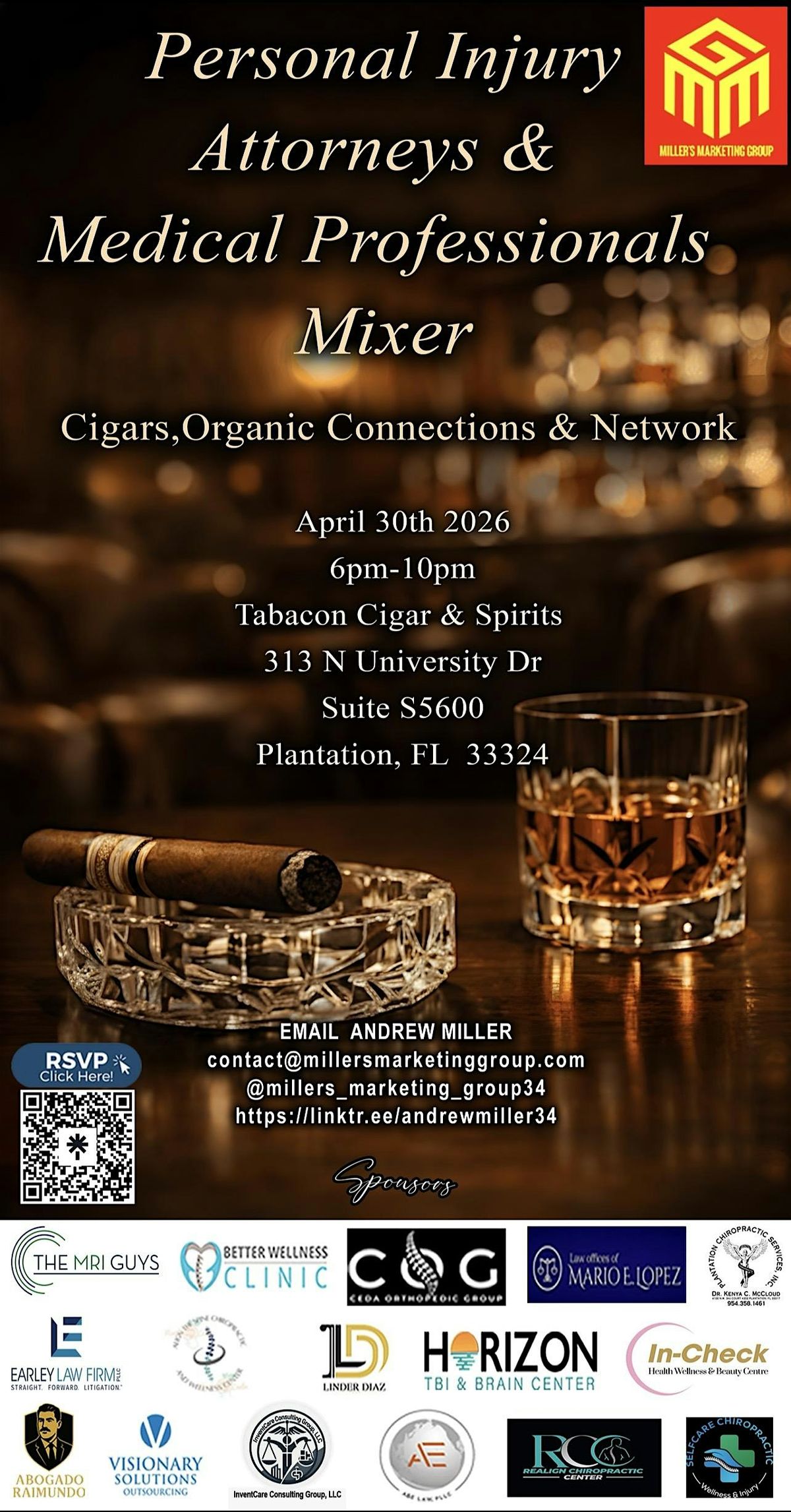 Join us at Tabacon Cigars and Spirits on April 30, 2026 at 6:00 PM (Eastern Time) for a relaxed evening connecting personal injury attorneys and medical professionals. It’s a great chance to network, share insights, and unwind together in a casual setting. Don’t miss out on this opportunity to build relationships and enjoy some great conversations!